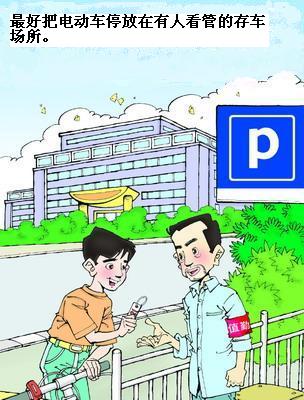 即使再好的车锁对自行车、电动车来说也并非绝对安全,因为采取拎起后架使后轮离地抬走、扛走或整车拉走等方法偷盗的案件时有发生。电动车不要乱扔滥放是防范盗窃的又一关键。特别是那些新型、高档、名牌自行车或电动车等。放置在住宅门口同样容易被偷,尤其在午休或者晚间就餐时间都是电动车丢失的高发时段;夜间电动车放在楼梯间也并不安全,除非直接搬入室内;在公共场合随意停放在街边路口、商店门旁、车站附近、市场周围,也没有安全保障。最好把电动车停放在有人看管的存车场所,花费小钱买大安全。
