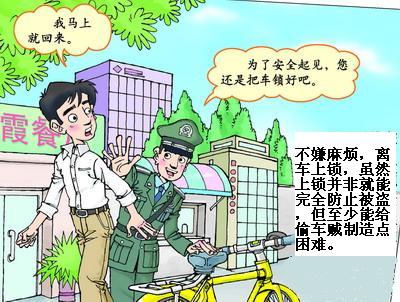 防范自行车、电动车被偷盗,最重要的是克服麻痹思想,离开车子时注意不要嫌麻烦,随时随地锁车尤为重要,这也是防范电动车被盗窃最起码应该做到的。不管在哪里,也不管在什么时间,离开电动车时必须上锁,哪怕是暂时离开瞬间返回。即使是在视线之内,也最好上锁,甚至应锁在比较坚固的固定物上。如果你嫌麻烦,那么贼偷也就方便了。虽然上锁并非就能完全防止被盗,但至少能给偷车贼制造点困难。因为无论大意忘锁还是嫌麻烦不锁,都会为见财起意、顺手牵羊的偷车分子提供便利条件。