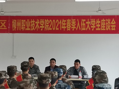 新闻网消息(图、文/ 保卫处 谭跃) 2021年3月15日下午,我校2021年春季应征入伍大学生座谈会暨欢送会在柳州军分区军事训练基地召开。鱼峰区武装部部长郭跃飞,我校副校长王伟、保卫处(武装部)处(部)长钟旭等负责人、相关工作人员及2021年春季应征入伍的32名学生参会。会议由钟旭主持。郭跃飞、王伟与应征入伍学生亲切交流,了解学生的入伍动机、服役部队以及今后的打算。