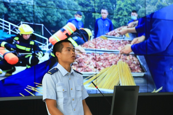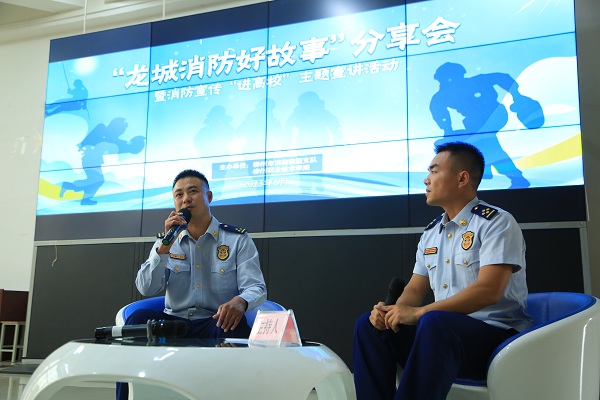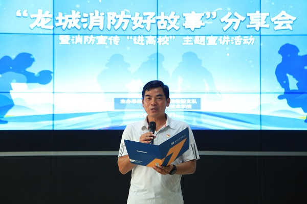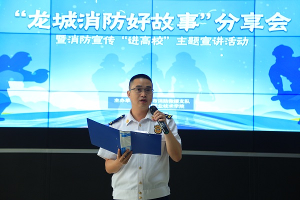 接下来是“龙城消防好故事”分享会。柳东新区阳和消防救援站站长何博分享了《青春在烈火中逆行》。何博用一次次出生入死的亲身经历滋养着满身的勋章,他谈到“我的青春,在一次次逆行战斗中绽放光彩,身上的伤疤成为我熠熠生辉的勋章”?!把眨帽?,有警必出,闻警即动”是何博日常工作生活的真实写照,何博的英勇事迹感染着在场的每一位师生。柳东新区花岭消防救援站站长助理曾义春分享了《我还是那个兵》。日常生活中,大家习惯称呼曾义春为“山哥”、“兵王”。自从加入消防队伍以来,曾义春始终严格要求自己,时时处处做好同志们的楷模,始终印证着“我还是那个兵”的初心使命。新入职消防员李家辉分享了《消防员梦想》。李家辉一年前还是一名普通学生,身材瘦小。通过勤学苦练,李家辉结实了很多,基础体能都达到了优秀,消防知识技能也达到了初级水平。