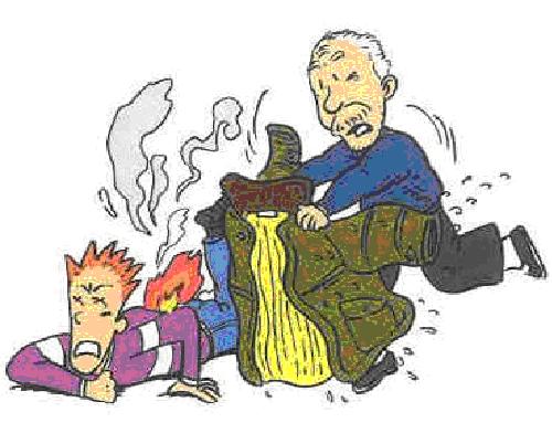 10、如身上衣物着火,可以迅速脱掉衣物,或者就地滚动,以身体压灭火焰,还可以跳进附近的水池、小河中,将身上的火熄灭,总之要尽量减少身体烧伤面积,减轻烧伤程度。