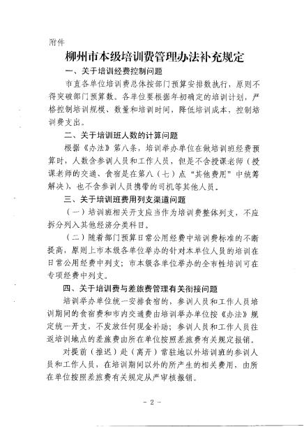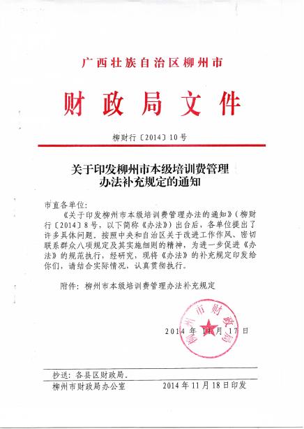 柳财行【2014】10号 关于印发柳州市本级培训费管理办法补充规定的通知 来源: 发布时间:2017-05-03 20:07:00 浏览次数: 次 【字体:小 大】 关于印发柳州市本级培训费管理办法补充规定的通知 柳财行【2014】10号(2017/4/25) 点击:1 关闭 分享到: 【打印正文】