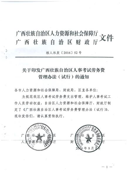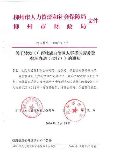 柳人社发【2016】112号 关于转发《广西壮族自治区人事考试劳务费管理办法(试行)》的通知 来源: 发布时间:2017-05-03 20:12:00 浏览次数: 次 【字体:小 大】 分享到: 【打印正文】