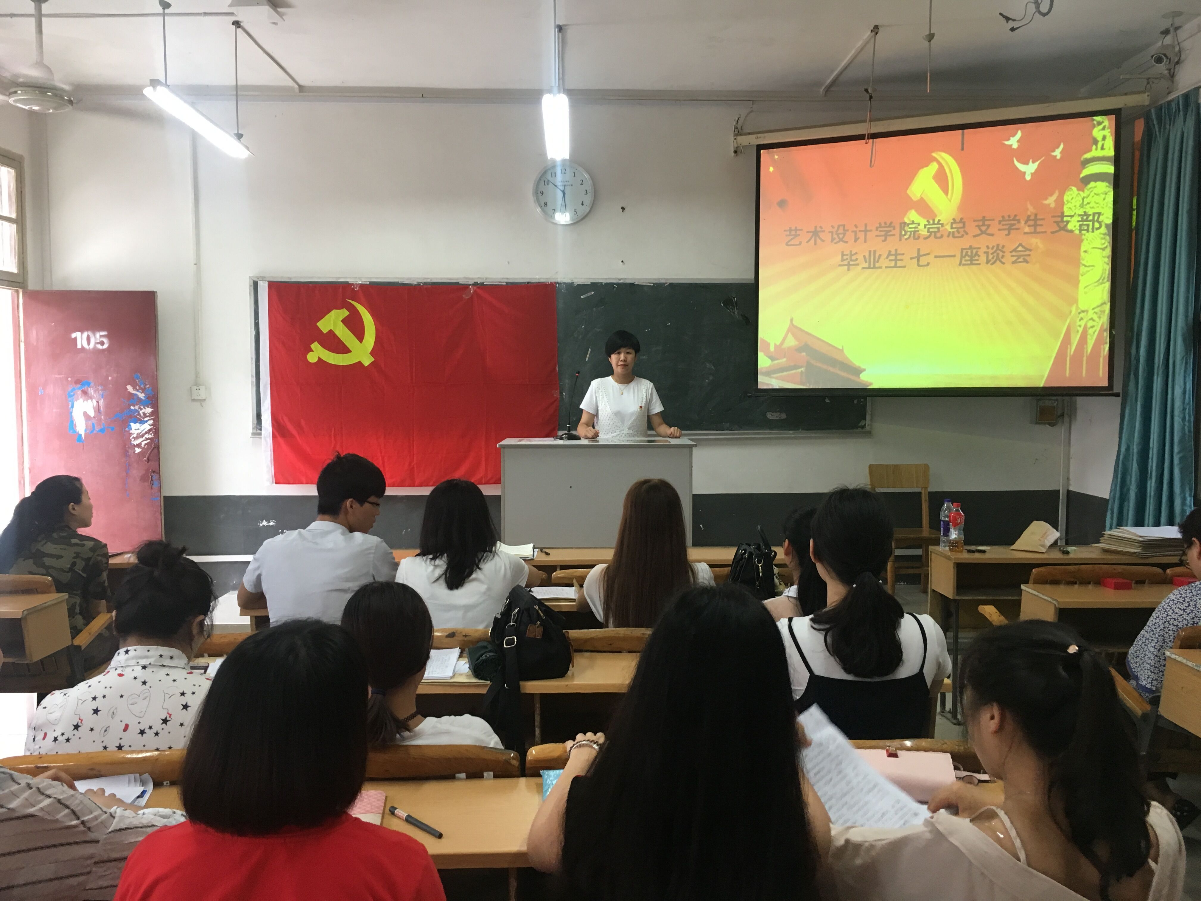 新闻网消息(文/艺术设计学院 王慧 图/艺术设计学院 白兰)2017年6月30日下午,艺术设计学院党总支学生支部召开庆祝建党96周年暨毕业生党员座谈会?;嵋橛裳Р渴榧前桌贾鞒郑Р咳宓吃辈渭幼富?。艺术设计学院党总支书记王慧发表讲话,并为即将走出校园的学生党员同志上了一堂“不忘初心跟党走”的主题党课,为毕业生党员上好“最后一课”。