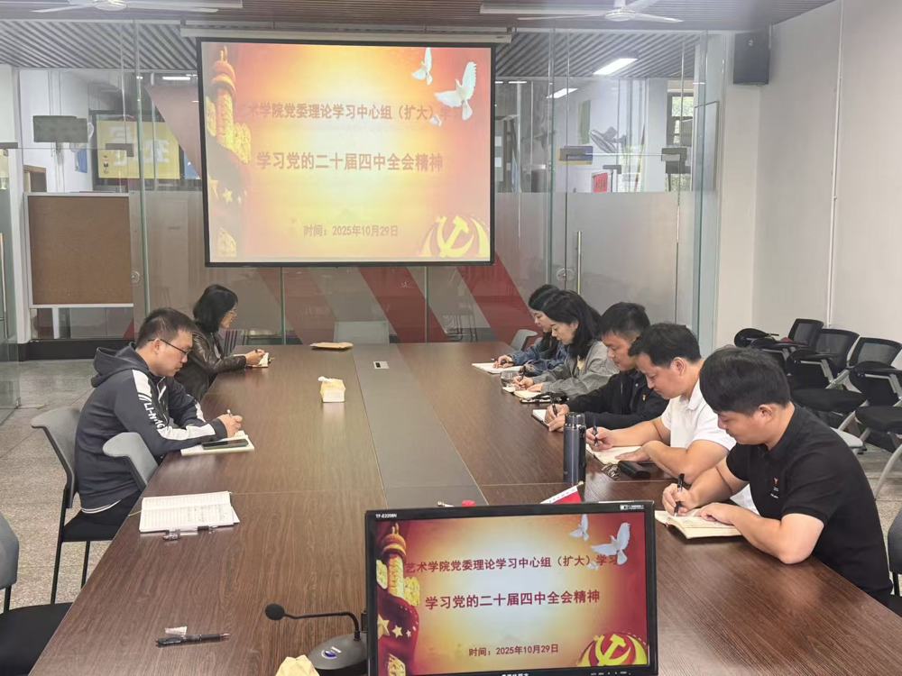 新闻网消息(文、图/艺术学院 杜昕)2025年10月29日上午,艺术学院党委在天工楼207会议室召开理论学习中心组(扩大)学习会议,深入学习领会党的二十届四中全会精神。会议由学院党委书记贾洪峰主持,学院科级以上领导干部、组织员、支部书记参加学习。