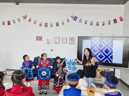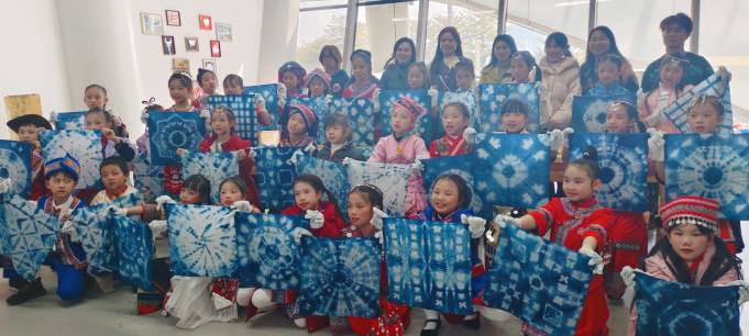 作为活动的协办单位,艺术学院由服装团队团长马云、王霞老师带队,为到场的小学生们带来了一堂生动有趣的非遗实践课。团队不仅展示了来自板蓝根等天然植物的染料及其制成的精美工艺品,还细致讲解了植物染的环保智慧与文化内涵。在实践环节,学生们在老师和志愿者指导下,亲手体验扎染技艺。从设计、捆扎到浸染、氧化,孩子们热情投入,创作出各具特色的蓝白图案手帕。现场气氛热烈,充满惊喜,孩子们在动手实践中深刻感受到了中华优秀传统文化的魅力。