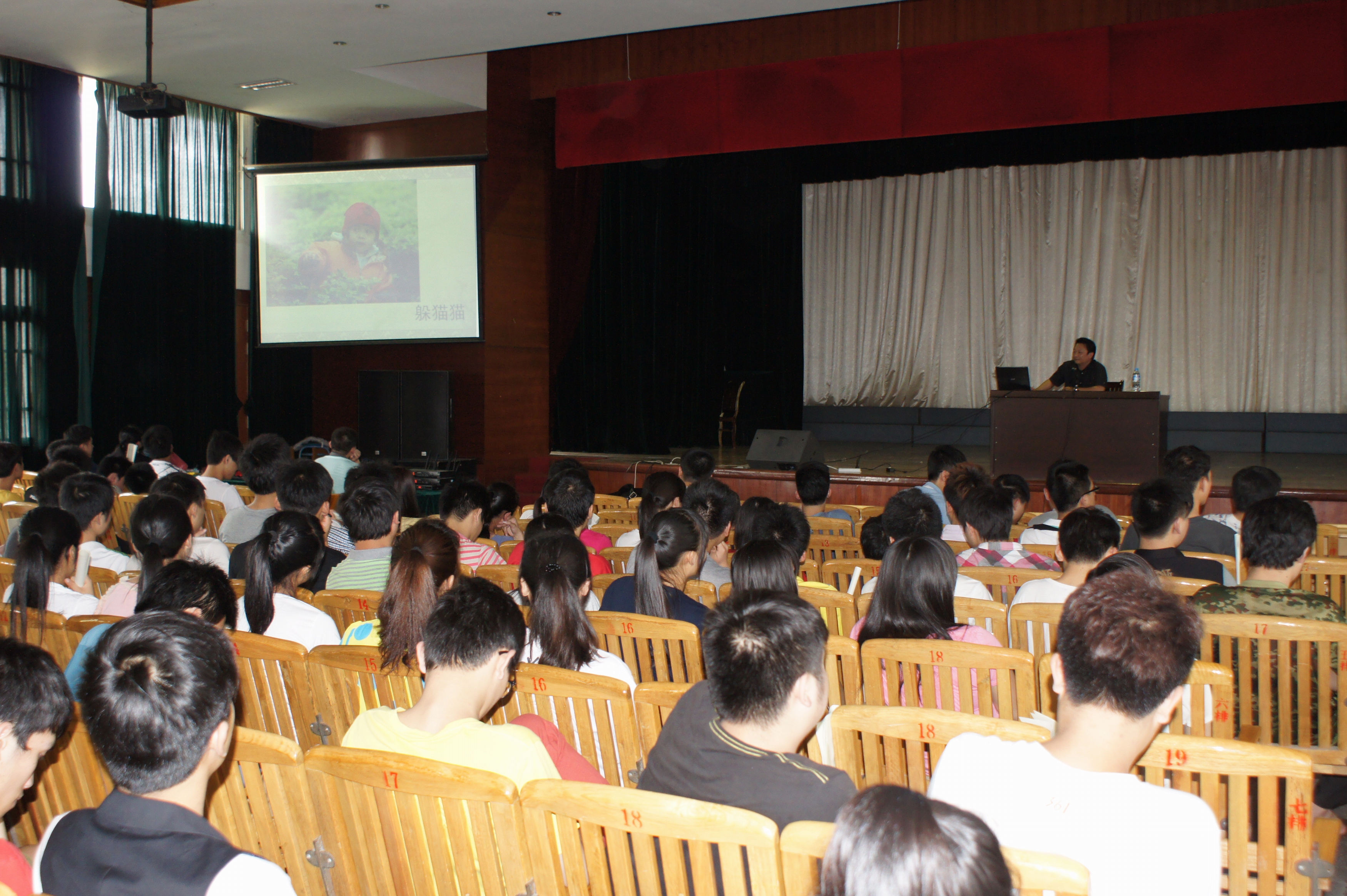 4月19日下午, 艺术设计系300余名学生在艺术校区大礼堂聆听了一场精彩的摄影讲座,活动由学院素质教育基地举办。 学院党委宣传部资深记者、摄影专家朱敬民副教授以《摄与被摄的技巧》为题,生动讲述了摄影构图、用光、取景和摆拍的技巧,从物理技术和人文内涵两方面阐释如何拍摄优秀作品,他结合自己多年的摄影实践经验讲解,图文并茂,深入浅出,生动幽默,精辟独到,让在座的师生们听了受益匪浅?!跋氩坏缴阌坝姓饷炊嗟难?,听了讲座收获太大了?!币幻刑镜厮怠? “摄影是辛苦的,被摄也是累人的,但美的追求是快乐的?!敝炀疵窀苯淌谧詈笞芙崴怠J堑?,对美和艺术的追求是无止境的,也是快乐的。(文、图/阎志斌)