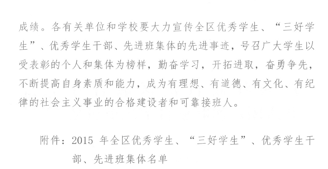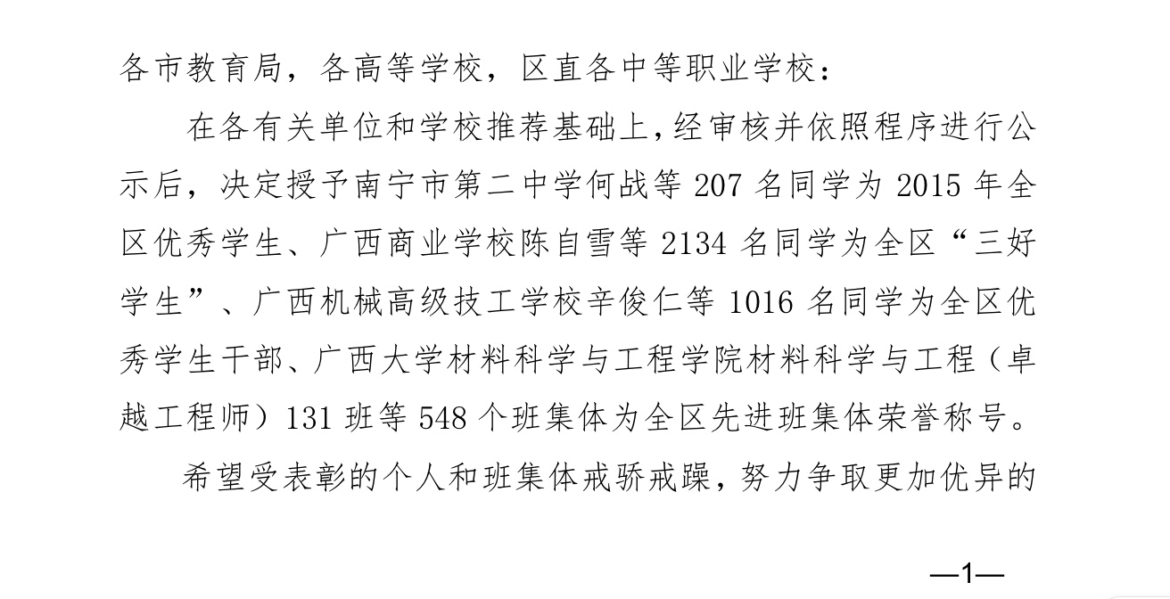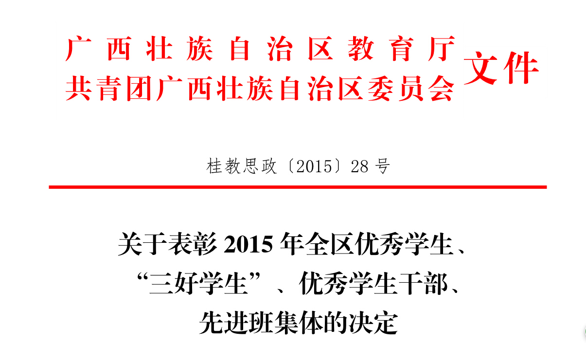 新闻网消息(通讯员/学工处 胡慕贤)为在全院学生中树立学习榜样,激励学生学习先进、崇尚先进、争当先进,我院推选若干学子参评2015年全区“三好学生”、“优秀学生干部”、“先进班集体”。近日,自治区教育厅下文(桂教思政〔2015〕28号),我院11名学生被评为全区“三好学生”、6名学生被评为全区“优秀学生干部”、4个班集体被评为全区“先进班集体”。 学院进行严格的审查和推选工作,力争所推选的学生不仅成绩优异,而且在同学们当中具有较强的号召力、能起到榜样的作用。经过严格评审,我院一批学生和集体入选各项先进或优秀行列,他们是—— 全区“三好学生”:黎海峰、梁品忠、梁沛、何富权、陈正华、杨力铭、钟奇桦、窦正全、林彩旋、丁倩、何海贵 全区“优秀学生干部”:张桂萍、潘俊霖、申燎宇、王永柠、丘俊惠、黎小荣 全区“先进班集体”: 2013机械质量管理与检测技术班(辅导员:黄曼)、2013级汽车检测与维修技术3班(辅导员:黄碧莹)、2012级物流管理3班(辅导员:陈卉)、2013级服装设计班(辅导员:罗柳萍) 希望受表彰的同学戒骄戒躁、勤奋进取,用自己的言行带动身边的同学;也希望广大在校生能以此激励自己,树立远大理想,脚踏实地、完善自己,为把自己培养成社会的栋梁而不懈努力。