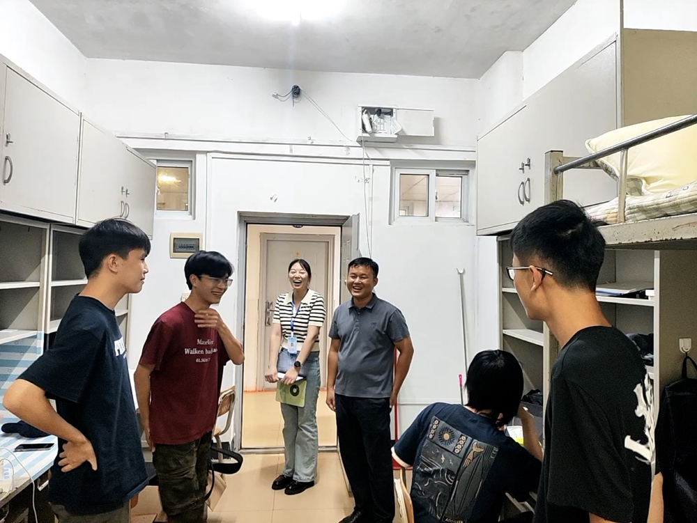 傍晚时分,学院党委书记贾洪峰与副书记蓝杜骞分别带领辅导员团队、辅导员助理深入学生宿舍,逐一走访看望新生,与新生们亲切交谈,仔细询问他们来自哪里、对新环境的适应情况以及是否习惯学校的饮食等,鼓励大家以积极心态迎接大学新生活,尽快融入艺术学院的温馨集体。交谈中,新生们积极分享了自己初入校园的感受和对未来大学生活的期待,同时也对领导和老师到宿舍看望自己表示感谢。