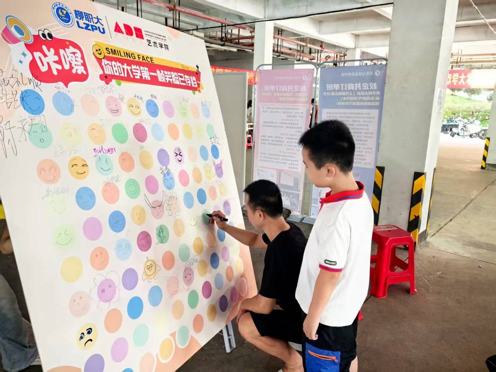 今年,艺术学院大本营别出心裁地设置了“笑脸墙”互动活动。新生们在笑脸墙上自由绘制属于自己个性笑脸,用画笔表达初入大学的喜悦与期待。现场还同步开展在线新生信息填报,并发放内含近日安排、军训提示与安全须知等实用信息的温馨提示卡片。学院也诚挚邀请新生关注官方微信公众号“柳职大缘起匠心”,以便及时获取更多学院动态与资源。各专业团队的教师也在大本营为新生提供了耐心细致的专业介绍,解答新生对于专业学习的疑惑。