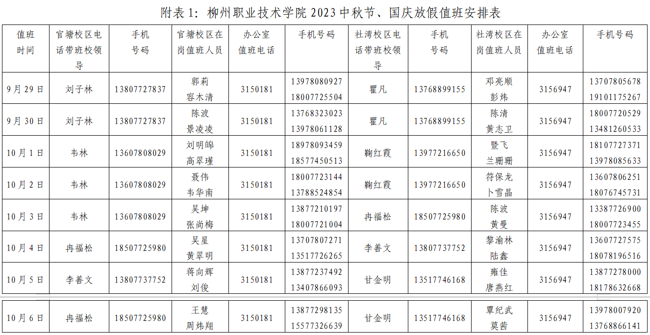 附表1:柳州职业技术学院2023年中秋节、国庆节值班安排表