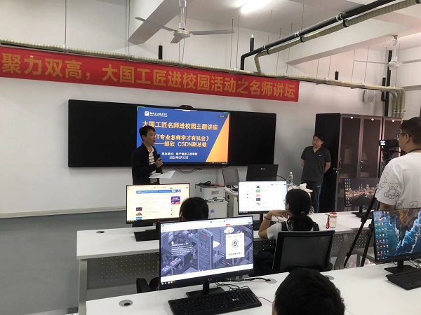 新闻网消息(文/电子信息工程学院 曾静 图/电子信息工程学院 付伟)为激励在校大学生努力奋进,成长成才,更好地提升学生专业认知,行业认知,职业认知,促进学院产教融合的发展,2023年5月12日下午,电子信息工程学院邀请到CSDN(中国开发者网络)副总裁邹欣到学校为同学们开展主题讲座。讲座设置为线上+线下会场,线下会场设在T2-A308,主题为《IT专业怎样学才有机会》。学院全体教职工和学生通过线上线下的不同方式参会。