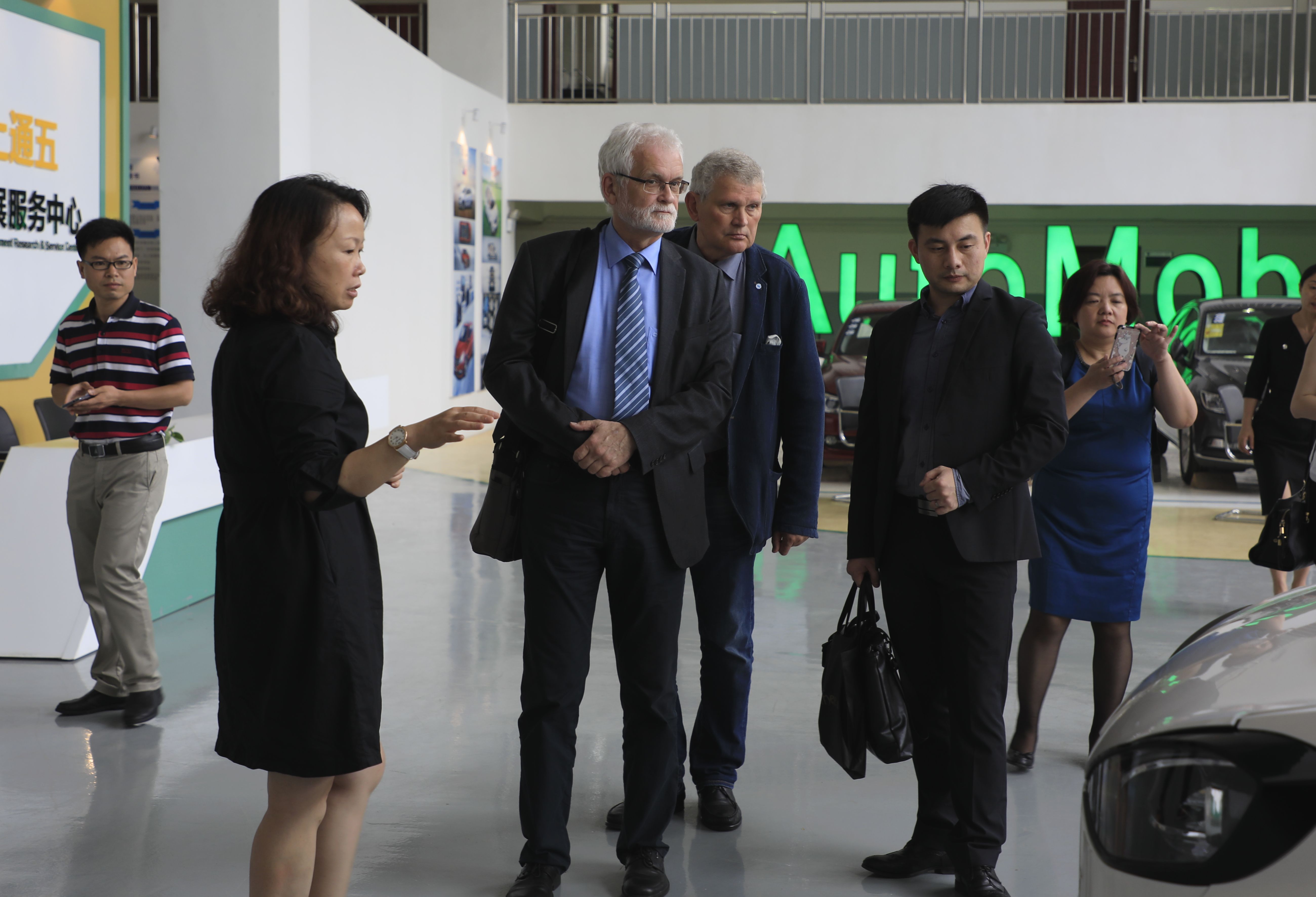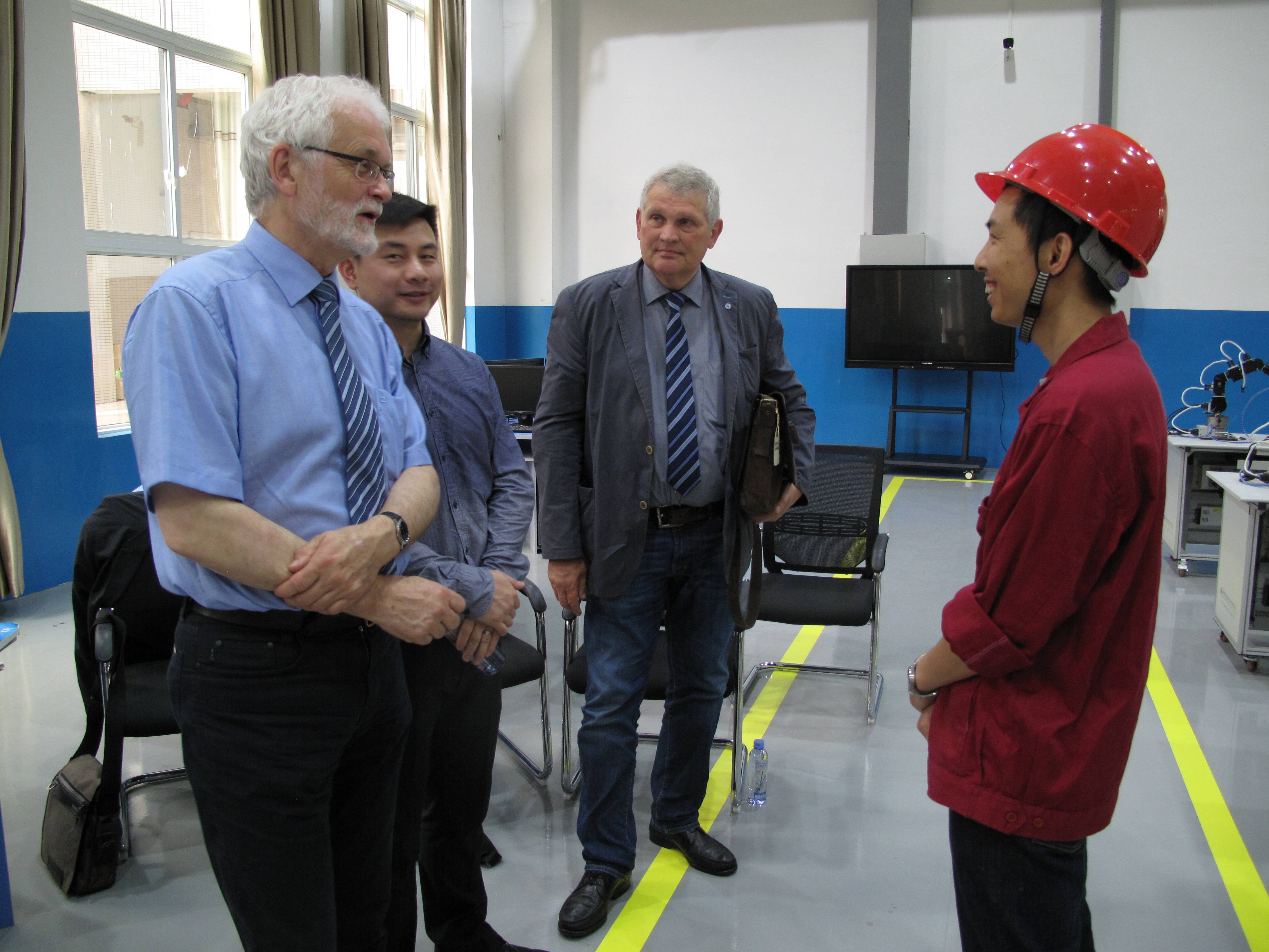 新闻网消息(文/国交处 黄俊 图/党委宣传部 朱敬民、国交处 黄俊、学校电视台 黄银礼)2017年5月19日-20日,德国下萨克森州文化教育协会理事兼教学研发总监克劳斯?比尔申克先生,下萨克森州文化教育协会理事、职业教育顾问、下萨克森州-不来梅州机动车行会联合会理事路德维希?吕德贝克先生等一行5人,到我校访问交流。学校副校长鞠红霞等热情地接待了来宾,并与比尔申克先生一行就双方开展中德职业教育交流合作的可能性进行了初步探讨与交流。