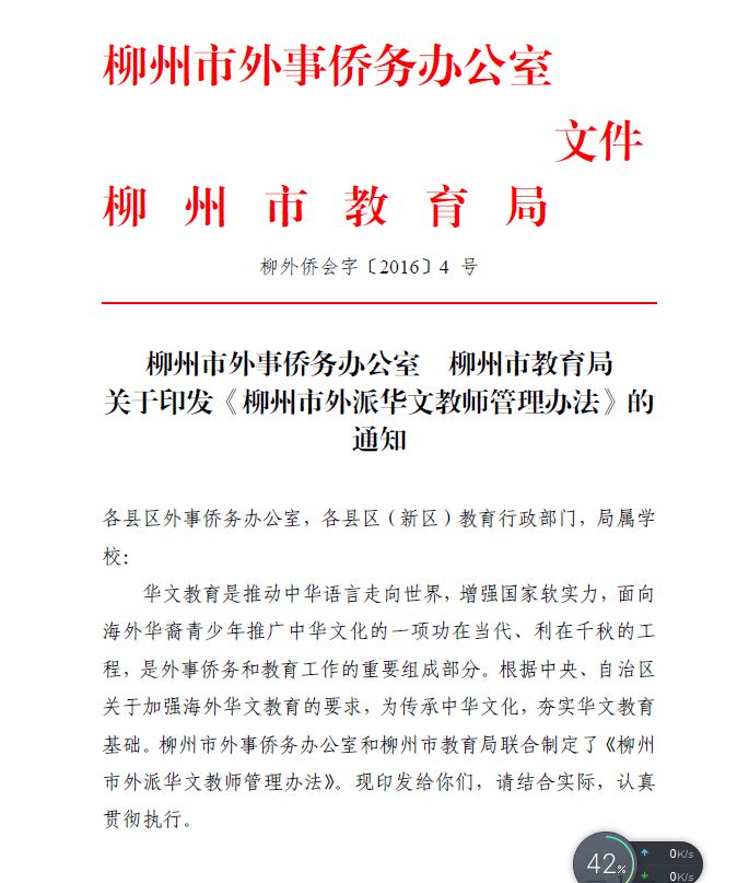 柳州市外事侨务办公室 柳州市教育局关于印发《柳州市外派华文教师管理办法》的通知( 柳外侨会字〔2016〕4 号) 来源: 发布时间:2017-08-18 15:28:00 浏览次数: 次 【字体:小 大】 分享到: 【打印正文】