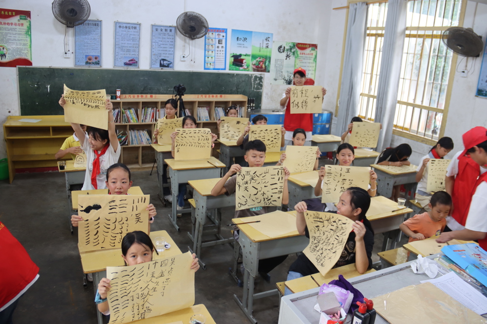 实践团为当地学生开设了书法、手工等传统文化体验课,将优质的文化资源送到了孩子们的身边。书法课堂上,队员们将规范汉字书写教学融入书法课程,让学生在书写中感受汉字的美与普通话的韵律;手工课上,他们用五彩斑斓的扭扭棒变幻出栩栩如生的图案,将民间艺术的魅力展现得淋漓尽致。除了传授知识外,实践团还注重培养学生的爱国情怀与民族自豪感。他们组织了一次升国旗活动,让孩子们在庄严的国歌声中感受到祖国的伟大与荣耀。通过这些活动,实践团不仅在孩子们心中播下了文化的种子,更激发了他们对传统文化的热爱与传承意识。