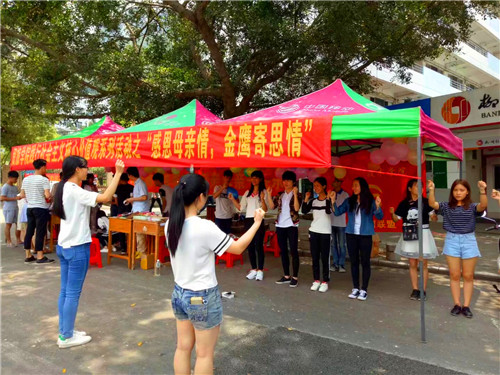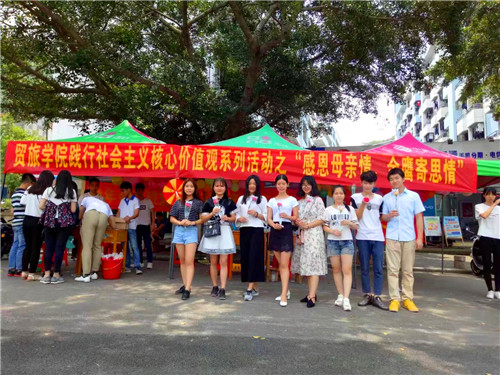 新闻网消息(文/图 贸易与旅游管理学院 吴鹏)5月14日,贸易与旅游管理学院携手青年金鹰联盟,在社湾校区坡下A区开展感恩母亲“践行社会主义核心价值观”“五四”青年主题系列活动。该院分团委书记吴鹏及全校500余名学生参加了本次活动。