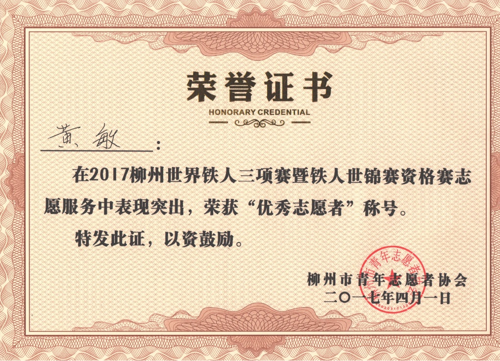 新闻网消息(文/校团委 周虹 图/校青年志愿者服务总队 廖俊、满世严)4月17日,从团柳州市委、市青年志愿者协会获悉,在2017世界铁人三项赛中国揭幕战赛事中,我校60名志愿者获“优秀志愿者”称号,校团委获“最佳志愿服务单位”荣誉称号。