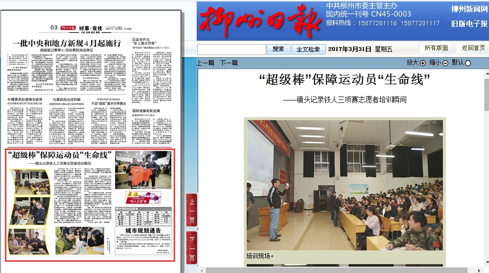 《柳州日报》以半个版面来报道我校铁人三项赛志愿者培训开展情况