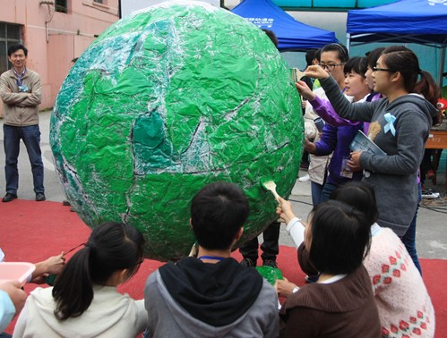 柳州市环保局龚继冬副局长致开幕辞,对我院此次活动表示充分肯定,对同学们为环保事业所做的努力感到欣慰。他说,美好的环境要靠日常的维护,而不是靠“治理”。他号召同学们在今后的学习和生活中继续秉承此次活动的主旨,从生活中的每一个小习惯、小行为做起,以实际行动关注环境,共建绿色地球家园。随后,阳旭副书记宣布 “我的中国梦——共创绿色家园”世界地球日环保宣传活动启动。随后,与会领导、嘉宾与我院七个系部学生会代表共同绘制 “绿色地球”?;疃弥褡?、废旧报纸等材料制作成地球模型,由领导、嘉宾与七个系部学生会代表分别为四大洋、七大洲描绘色彩,添绿添蓝,整个“地球”逐渐由灰变绿。此仪式表达了我院各系手携手共建绿色家园的心愿。
