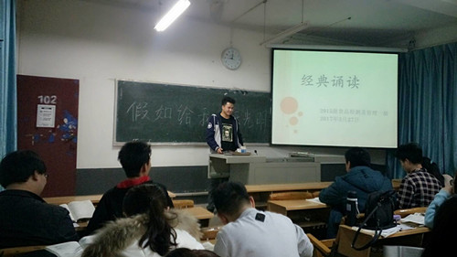 3月27日,在文华楼102教室,2015级食品检测及管理一班开始了第一次经典诵读活动。班长韦宏诚诵读了海伦凯勒的《假如给我三天光明》,希望同学们坚强面对所有的不如意,坚信只有不放弃,自强不息,平凡的人生才会绽放出不平凡的生命光彩。4月6日,团支书刘永倩诵读海明威的作品《老人与海》,愿每个人都能练就精湛的技艺,顽强战斗、永不言败。