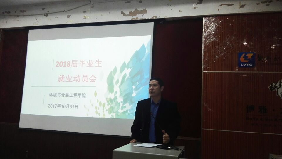 新闻网消息(文/环境与食品工程学院 莫丽梅 图/环境与食品工程学院 陈富贵)为使我院2018届毕业生了解当前高校毕业生就业形势,进一步转变同学们就业观念及提高就业能力,10月31日晚环境与食品工程学院组织2018届毕业生在德馨楼101教室,召开就业动员会。我院2015届全体毕业生,以及学院党总支副书记黎晓灵老师、学生专干陈富贵老师、辅导员莫丽梅老师参加了动员会。