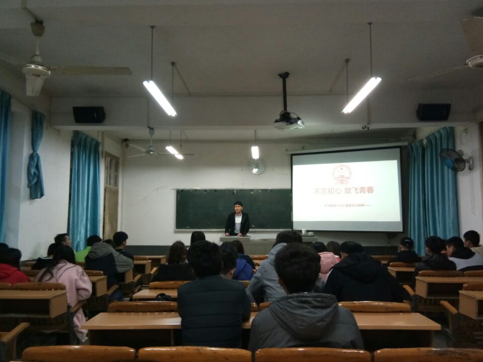 12月14日晚,在德馨楼101教室学生党员、环食学院上一任学生会主席伍婕妤同学给2017级食品检验、环境工程、环境控制等三个班级学生作了《不忘初心 牢记使命》为主题的党的十九大精神学习分享。
