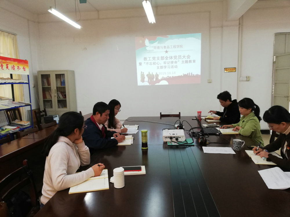 新闻网消息(文/环食学院 韦尉宁,图/环食学院 孟莎莎)2019年10月18日下午,环境食品工程学院教工党支部在该学院党员活动室开展“不忘初心、牢记使命”主题教育学习体会交流会,由支部书记黄姿梅老师向党员报告个人学习体会,从教师岗位出发谈如何践行“不忘初心、牢记使命”。教工支部全体党员参加了交流会。