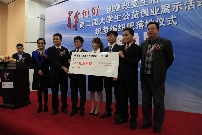 项目落地仪式上,卢川(左三)与团队成员们一起,高兴地拿着企业赞助的5万元创业资金支票合影。