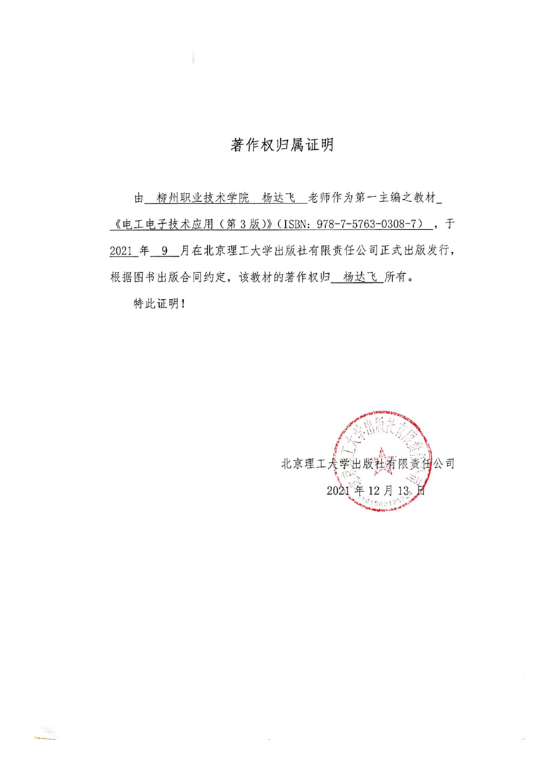 申报教材著作权归属证明材料《电工电子技术应用(第3版)》