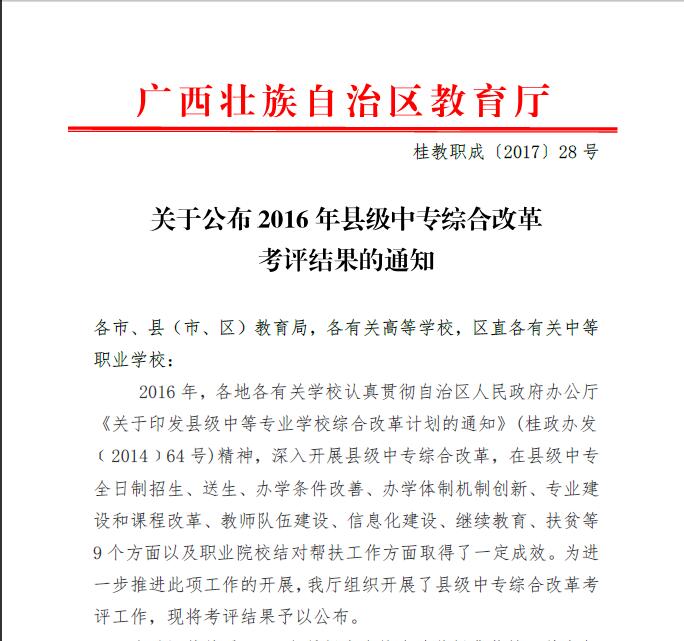 新闻网消息(通讯员/ 教务与实训管理处 刘晶)近日,自治区教育厅下发了《关于公布2016年县级中专综合改革考评结果的通知》(桂教职成〔2017〕28 号),我??沟亩钥谥гぷ髟俅位窠薄倩?016年全区县级中专综合改革帮扶奖。在自治区教育厅开展的县级中专综合改革考评中,我校连续四年获得此项殊荣。