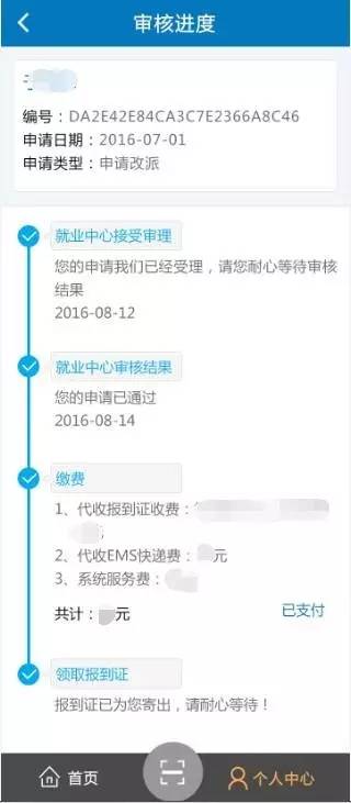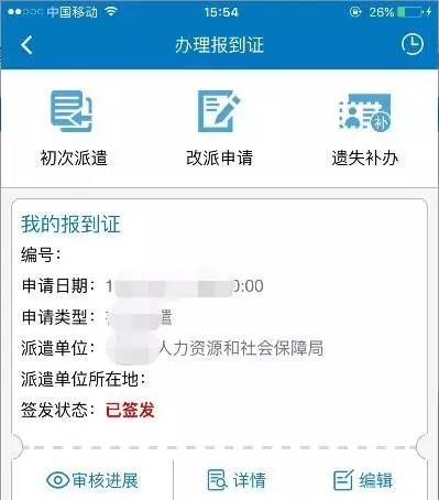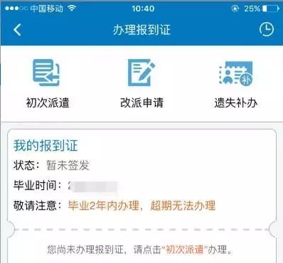 办理报到证的日志信息将会出现在APP上。请选择对应的业务进行办理。如图3.4,3.5所示。办理流程:填写派遣去向信息,上传相关材料图片,等待审核信息,审核通过(如不通过,修改重新提交申请。改派时需要邮寄回旧的报到证及通知书副本),缴费,等待查收新证。