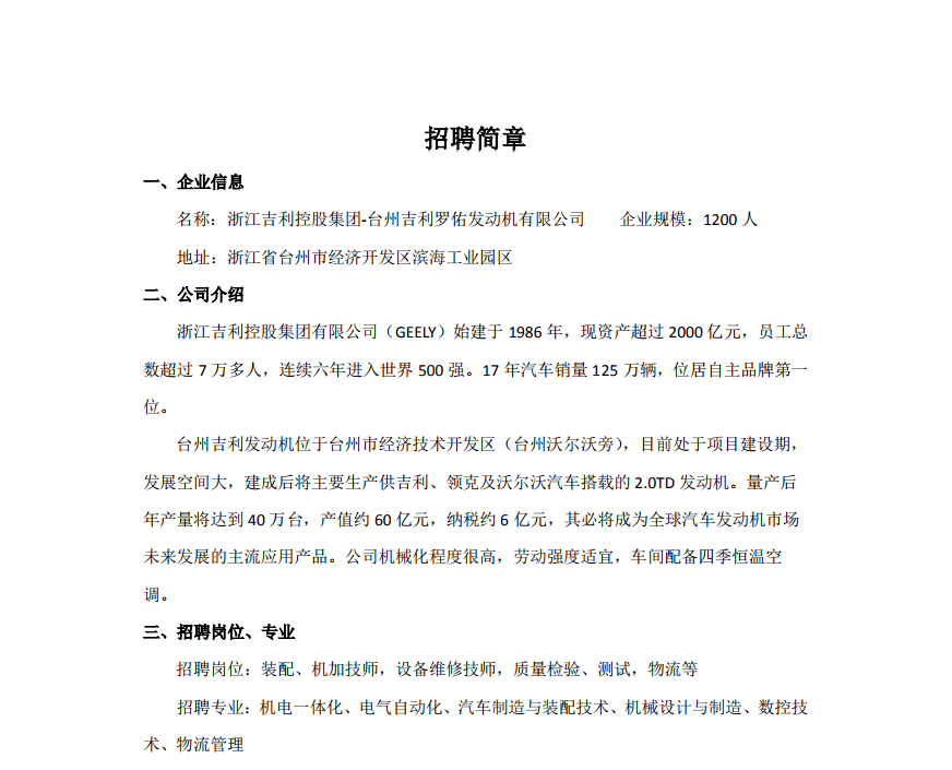 浙江吉利控股集团-台州吉利罗佑发动机有限公司招聘简章