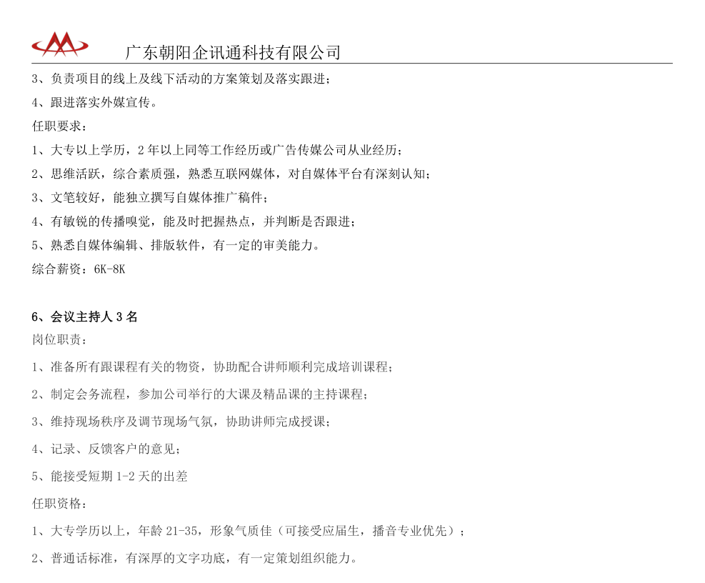 广东朝阳企讯通科技有限公司招聘简章