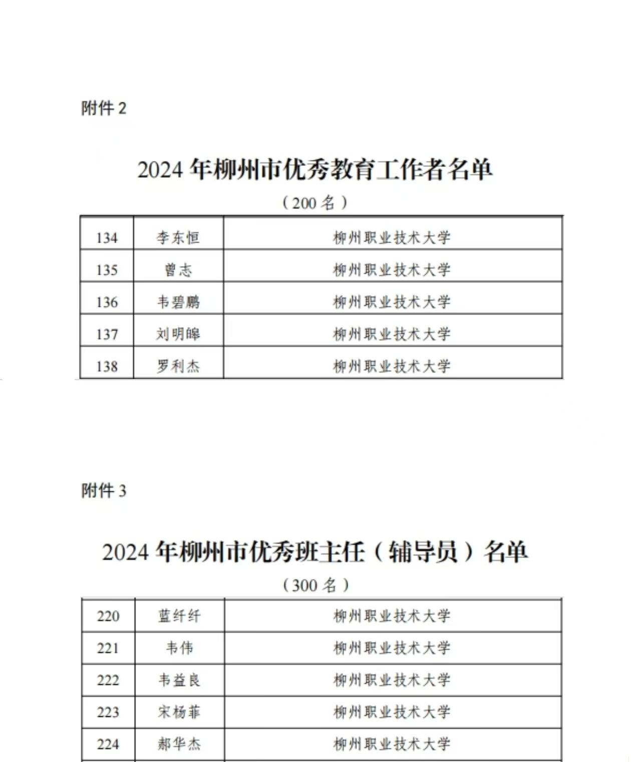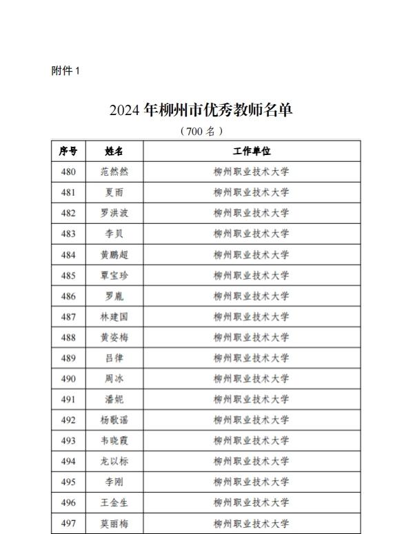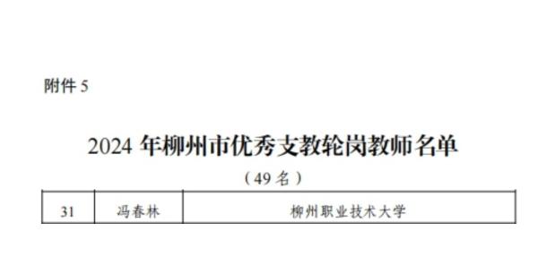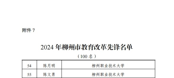 新闻网消息(文、图/人事处 杨婉珍)根据柳州市教育局《关于表扬2024年柳州市优秀教师、优秀教育工作者、优秀班主任(辅导员)、师德模范、优秀支教轮岗教师、优秀责任督学、教育改革先锋的通知》(柳教人〔2024〕22号),对我校范然然、夏雨、罗洪波、李贝、黄鹏超、覃宝珍、罗胤、林建国、黄姿梅、吕律、周冰、潘妮、杨歌谣、韦晓霞、龙以标、李刚、王金生、莫丽梅等18位柳州市优秀教师;蓝纤纤、韦伟、韦益良、宋杨菲、郝华杰等5位柳州市优秀班主任(辅导员);李东恒、曾志、韦碧鹏、刘明皞、罗利杰等5位柳州市优秀教育工作者;吴坤、韦壮、范海静等3位柳州市师德模范;柳州市优秀支教轮岗教师冯春林,以及陈月明、陈文勇等2位柳州市教育改革先锋给予表扬。