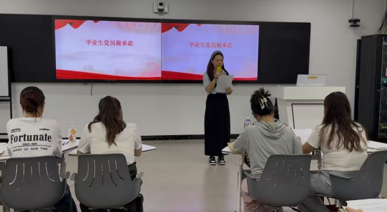 活动中,全体党员一同观看了2025年“‘青春心向党 奋斗新征程’党课开讲啦”比赛的优秀视频。视频中优秀党员的先进事迹和奋斗精神,深深感染了在场的每一位毕业生党员。随后,毕业生党员蒋云馨代表全体党员作出公开承诺:“离校不离党、退伍不褪色,以奋斗姿态书写青春答卷。”最后,在何敏华的领誓下,全体党员面向党旗,在党旗下庄严宣誓。铿锵有力的誓言在教室中回荡,彰显了毕业生党员坚定不移听党话、跟党走的信念与决心。