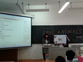 班会前,同学们积极搜集动物的相关资料,与小组成员相互协作,设计完成一份份关爱动物的手抄版英文海报,在班会上展示小组的作品并做英文发言。发言者动情地讲述自己所想所闻所感,同学们为之动容,为之感慨。随后,大家进行了积极热烈的讨论,每一位同学都意识到了保护动物的重要性。