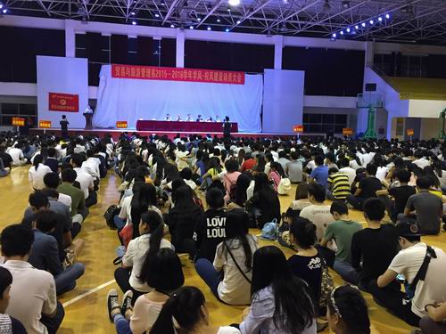 新闻网消息(通讯员/贸旅系 朱汝群)10月29日晚上7:00,贸易与旅游管理系2015-2016学年学风校风建设动员大会在学院体育馆召开。该系党总支书记牛永惠,系主任何志忠,副主任谭欣、林志红,教学团队负责人,全体行政人员和辅导员,以及2013级、2014级和2015级共1000多名学生参加了大会。大会由团支部书记覃慧川主持。