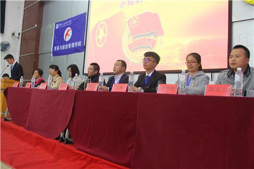 校团委副书记杨小浒讲话。过去的一年是贸易与旅游管理学院重要的一年,这一年该院共青团、学生会紧紧围绕学校中心工作,突出重点、挖掘特色、立足创新、注重实效,以理想信念教育为核心、以校园文化活动为平台、实践社会主义核心价值观为引导,在校内开展了抗日精神演讲赛、雷锋精神辩论赛、新生杯篮球赛和乒乓球赛;开展团结立志感恩主题活动、奔跑吧校园等主题教育活动,还结合该院4个社团开展丰富多彩的社团活动。在校外,该院与6个社区合作,累计组织400余名青年开展72次社会服务活动,在争先创优上获得“五四红旗团支部”称号、柳州市2017年“青春红旗号”立项建设集体。该院的团、学组织是有朝气的、有活力的、有力量的,工作有思路的、有创新、有实效;学生有理想、有担当、可以信赖。希望该院团、学组织以及广大青年能从学校事业发展大局出发,以饱满的政治热情和严肃负责的态度,明确光荣使命,认真履行职责,同心同德、畅所欲言、工商贸旅大计,把我校建成特色鲜明的高职名校而努力奋斗。