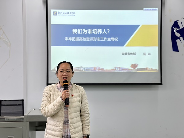 会上,杨琳首先强调高校是意识形态工作的重要领域,是意识形态工作的前沿阵地,高校教师要充分意识形态工作的极端重要性。接着,她从党和国家、高校办学、党员干部和高校三个层面,对意识形态进行了深入解读,并指出意识形态工作要从课堂教育教学管理、宣传思想阵地管理、网络意识形态管理、有关项目资金管理、人员管理、各类社团管理、抵御和防范邪教渗透、师生思想政治工作等方面进行加强,同时通过分析一些具体案例中存在的意识形态问题,告诫大家要坚决抵制和清除各种错误思潮和言论的影响,营造风清气正的校园文化氛围。最后陈月明强调,全体教职工要切实提高政治站位,牢记“为党育人、为国育才”使命,守好意识形态阵地,增强意识形态斗争能力和本领,牢牢把握意识形态工作的主动权。