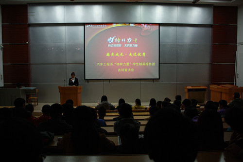 2013年11月15日下午,汽车工程系“榜样力量”学生精英报告团在博闻楼110举行了首场宣讲会。该系党总支书记杨琳、学生科长唐艳、学生专干曾志以及辅导员和2013级新生共500多人分两场参加了宣讲。
