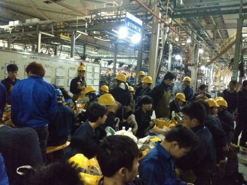 顶岗实习的同学们正在认真听从工段长工作安排,忙碌的一天从此刻开始
