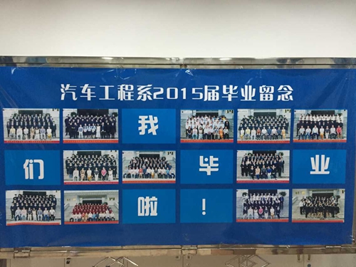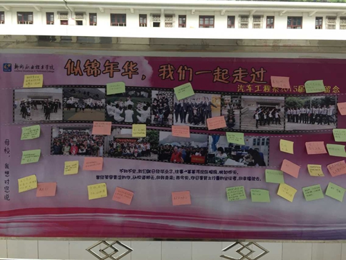 下午三点,该系辅导员在文华楼一、二楼发放毕业证 ,该系在文华楼精心布置展板,通过展板向毕业生展示他们大学三年的生活掠影,让毕业生再一次对过去三年进行了回眸,并在留言板上写下对母校的祝福。汽检学生马建国写道:“三年匆匆,只需认真珍惜我们身边的人和事,学长我走了,学弟学妹加油!”另一学生留言道:“请珍惜时光,不让自己的大学生活留下遗憾,人生都应该有这样奋斗过的轨迹。”诸多留言表达出了毕业生们对母校的眷恋及对学弟学妹们深深的祝福。