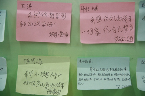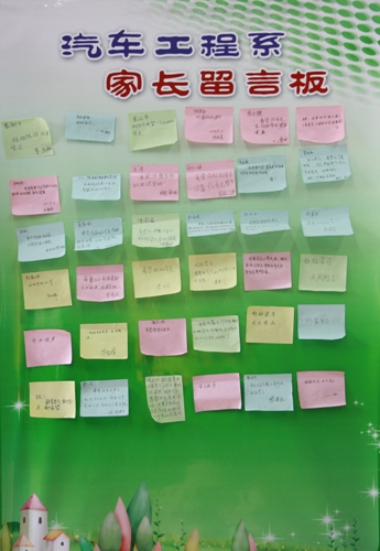 今年的迎新工作,汽车系的又一个亮点便是在家长休息区设立家长留言板,让在休息区的家长们把自己最想说的话写在便条纸上,家长在留言板上表达他们的情感,也表达他们对新生的祝愿与期望。留言有鼓励新生好好学习的,也有祝福健康成长的,还有希望平安快乐的......看着留言板上满满的祝福,该系不少2015级新生深受感动。据悉,该留言板将在系里展出两周,让新生们也相互分享家长对自己的祝福。