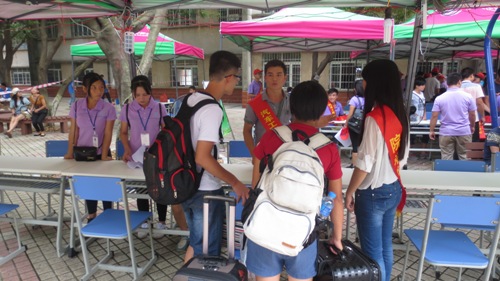 迎新工作井然有序地开展着,机电系身着紫色系服的志愿者给了新生和家长最深刻的印象。本次协助系部开展迎新工作的志愿者共计200余人,都是该系2013、2014级的学生干部、班级志愿者,在整个迎新工作期间,仍有不少同学主动加入到这支队伍中,都在力争为系部作出自己的贡献??吹接行律袄幢ǖ剑驹刚呙锹砩衔⑿ψ庞先?,接下新生和家长手中的行李,递上水,耐心解答学生家长的疑问。在暴雨中,志愿者们没有一个退缩,依然是一张张热情的笑脸,一句句亲切的问候,一项项贴心的服务。志愿者们以百分之百的热忱为新生和家长提供了周到的服务,让2015级新生感受到家庭般的温暖。