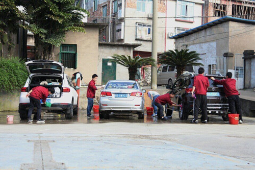 这已经是该班第三次举行义务清洗和维护保养汽车活动了,学生们对清洗、保养汽车的方法和操作流程都已经驾轻路熟,他们早早就来到竞择楼前为活动分组、准备工具,以最饱满的热情等候老师们的到来。