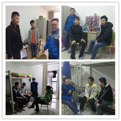 在除夕前的走访过程中,副院长邓益民及专业班主任谭新曲认真巡查学生宿舍,详细了解学生的实习、住宿条件等情况,提醒学生要理论联系实际,认真学习专业知识,注意安全,为每一位实习的同学送上节日慰问礼包,送去新春的祝福。