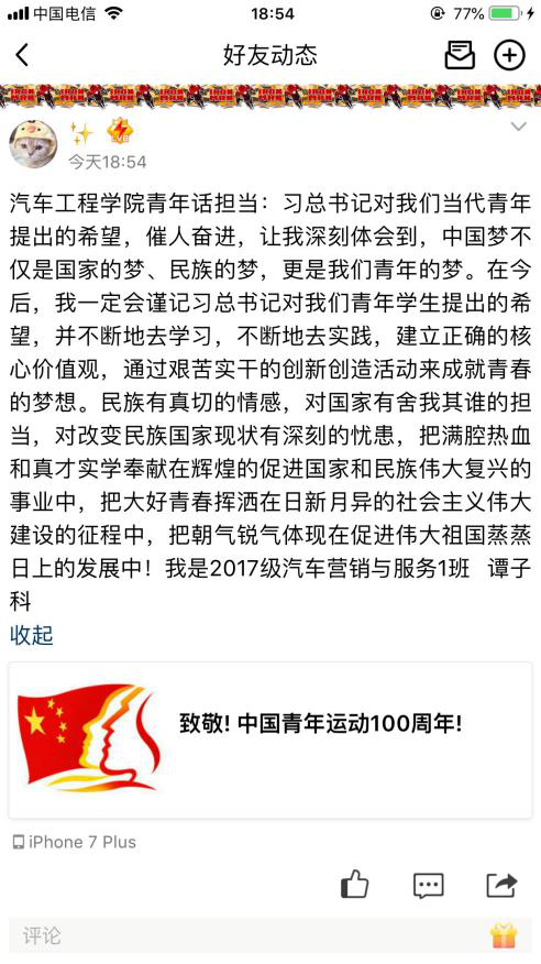 5月4日一大早,该院学生便在微信朋友圈和QQ空间里转发团中央、学校纪念五四运动100周年的相关文章。其中,共青团中央官方微信公众号发布的文章《致敬!中国青年运动100周年》,通过时空穿越回顾了五四运动至今100年来青年新思想的发展。同学们阅读了文章后,深受鼓舞,思想也得到了升华。青年兴国家兴、青年强国家才会富强,同学们纷纷表示要勇担民族复兴的大任,为实现中华民族伟大复兴的中国梦而努力奋斗。