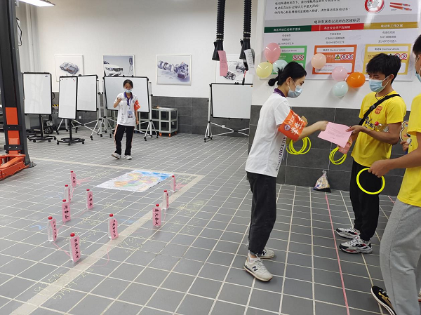 最后,全体学生党员前往游戏区,参与套圈游戏。学生在复现的红军长征路线图里,大声朗读《七律?长征》,并用塑料圈套中长征目标点。大家参与游戏获得多张积分券,并用积分券换取许多精美的小礼品。