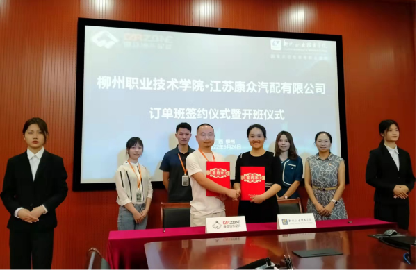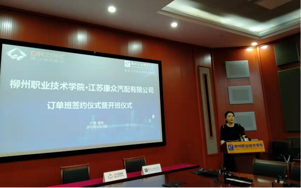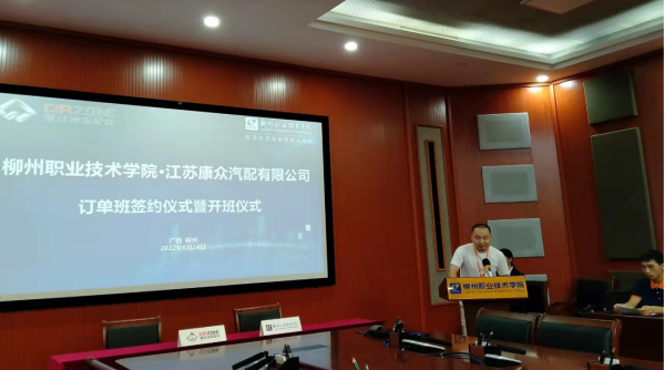 江苏康众汽配有限公司B2B运营部人事行政经理隋鑫在致辞中表示,非常感谢柳州职业技术学院能大力促进双方的这次合作,能让新康众在推进产教融合,学校专业建设,老师教材教法,学生的就业创业等方面做出贡献。最后期待新康众和柳职在后续合作中能紧扣行业发展趋势,不断完善协同育人机制,培养出更多汽后市场高素质高技能人才,期待本届订单班同学们学有所获,学有所成!