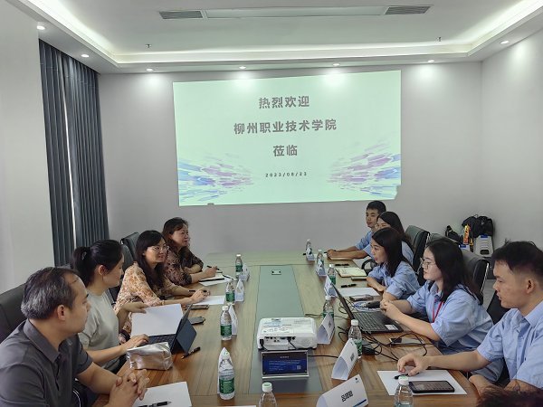 弗迪南宁工厂人事经理黄蓓、人事科长曾静静等热情接待了韦林一行,会上邀请了我校毕业生员工黄祖同(15 届工业机器人技术专业,现为弗迪南宁工厂设备工程师)等4位代表共同参加,双方在公司办公楼开展座谈交流。